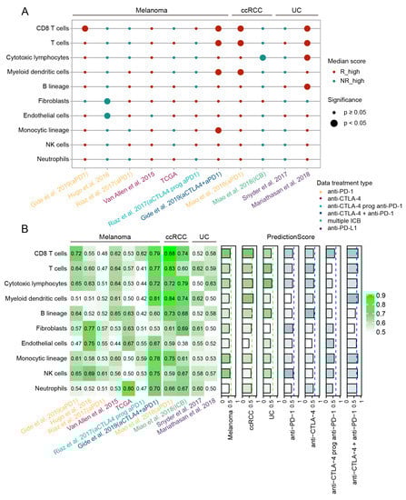 Different TME components also showed distinct correlations with ICB response in different cancer cohorts following various ICB therapy strategies. Among these, CD8 T cell and T cell showed the most significantly positive correlations with response to ICB immunotherapy across melanoma, ccRCC and UC. Notably, high abundances of CD8 T cells, T cells and myeloid dendritic cells were significantly associated with clinical response in melanoma treated with combined anti-CTLA-4 and anti-PD-1 therapy, while in ccRCC, these cell populations showed positive correlation with response for patients treated with anti-PD-1. For UC patients, the abundances of CD8 T cells, T cells, cytotoxic lymphocytes and especially B lineages were significantly higher in the responders treated with anti-PD-L1 therapy. This was consistent with recent reports that B cells were associated with immunotherapy response to ICB in patients with metastatic melanoma, RCC and soft-tissue sarcoma [54,55]. Moreover, we also found that the stromal composition including fibroblasts and endothelial cells had significantly lower abundance score in responders only from the Hugo et al., 2016 dataset (Figure 7A, p < 0.05 for all, Wilcoxon Rank Sum Test).