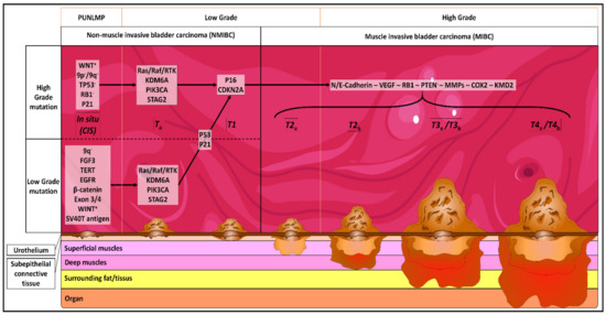 Genetical and physiological evolution of bladder cancer (BC). CIS: carcinoma in situ: “flat tumor”; Ta: noninvasive papillary carcinoma; T1: tumor invades subepithelial connective tissue; T2a: tumor invades superficial muscularis propria (inner half); T2b: tumor invades deep muscularis propria (outer half); T3a: tumor invades surrounding fat/tissues microscopically; T3b: tumor invades surrounding fat/tissues macroscopically; T4a: tumor invades prostatic stroma, uterus, vagina; T4b: tumor invades pelvic wall, abdominal wall. PUNLMP = papillary urothelial neoplasm of low malignant potential.