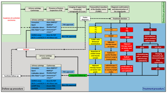 For the follow-up of patients, one of the major issues is the invasiveness of tests and their repetition over time. The recurrence of these invasive tests can lead to urinary tract infections, pain, or discomfort, leading to the patient’s own discontinuation of follow-up care. In addition, lifelong follow-up leads to heavy financial burdens. Therefore, noninvasive assays with a high specificity, high sensitivity, and moderate cost would be greatly beneficial. Many of the assays described here could, or are, used as follow-up assays, especially because some of them have high specificity and sensitivity, and are specific to stages of BC and as easy to perform as BTA assays. Therefore, follow-up assays could be selected according to patient profile and effectiveness. Urovysion assays and UroSEEK assays seem to work for BC recurrence detection.