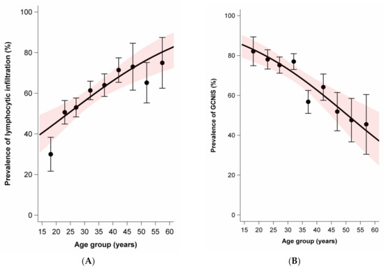 Lymphocytic infiltration increased with age among all three histological subgroups (Figure S3). The age pattern of tubules with infiltrating lymphocytes differed by histological subgroup. Whereas pure nonseminoma and seminoma-plus-nonseminoma showed an increase in tubules with infiltrating lymphocytes with age, their prevalence sharply decreased with age in pure seminoma (Figure S4).