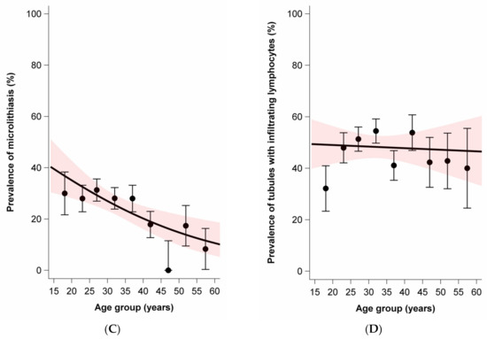 Age dependence of lymphocytic infiltration, germ cell neoplasia in situ (GCNIS), testicular microlithiasis, and tubules with infiltrating lymphocytes among sporadic and familial testicular germ cell tumors. Dots and whiskers indicate the age group specific prevalence +/− 1 standard error; the red bands display the 95% confidence interval (95% CI) bands; all models include age only; odds ratios (OR) per 5-year age increase. (A) Prevalence of lymphocytic infiltration by age at diagnosis. OR = 1.21 (95% CI: 1.11–1.33). (B) Prevalence of GCNIS by age at diagnosis. OR = 0.78 (95%CI: 0.71–0.87). (C) Prevalence of microlithiasis by age at diagnosis. OR = 0.83 (95%CI: 0.74–0.93). (D) Prevalence of tubules with infiltrating lymphocytes. OR = 0.99 (95%CI: 0.90–1.08).