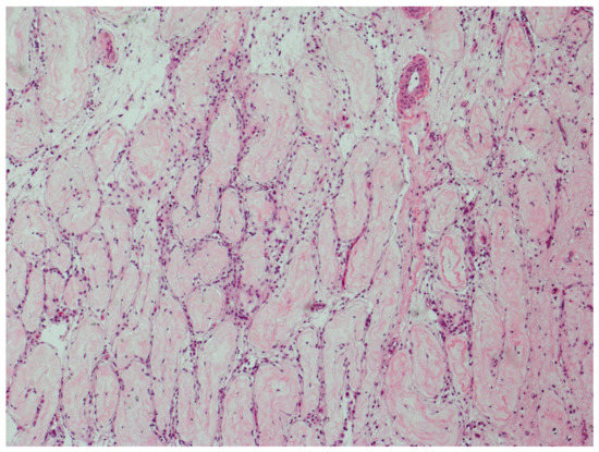 GCNIS cleared by host response. Parenchyma from which the host response has completely cleared GCNIS over time. All tubules have changed into thin fibrotic strands with scattered lymphocytes. (hematoxylin and eosin staining ×50 magnification).