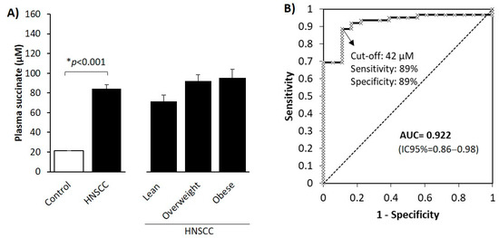 To test the value of the basal succinate level for HNSCC diagnosis, we performed ROC curve analysis. The area under the curve for succinate levels predicting the presence of HNSCC was 0.922 (95% CI 0.86–0.98) (Figure 1B). The best cut-off value of succinate according to the Youden index calculation was 42 µM (sensitivity 89%; specificity 89%).