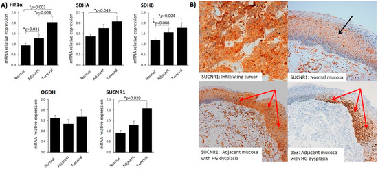 The mucosa adjacent to the infiltrating tumor showed a heterogenous pattern of SUCNR1 expression. We found that p53-positive areas, that highlight regions of high grade epithelial dysplasia, had stronger SUCNR1 protein staining than areas with normal histology (Figure 2B, lower left image). Additionally, the gene expression of HIF-1α, SDHA, SDHB, and SUCNR1 in adjacent mucosa was higher than in normal mucosa, which was statistically significant for HIF-1α and SDHB (Figure 2A).