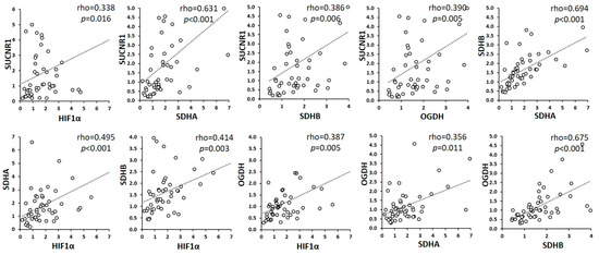 Correlations between HIF-1α, SDHA, SDHB, OGDH and SUCNR1 expression in tumors. Associations between variables were calculated using Spearman’s rank-order correlation test for nonparametric values. Rho coefficients were considered statistically significant at p < 0.05.