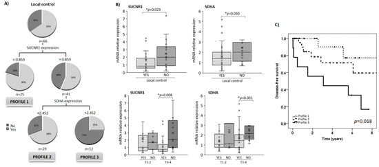 SUCNR1 and SDHA expression is associated with the locoregional control of the HNSCC disease. (A) Classification and regression tree for disease-free survival rates based on the tumoral expression of SUCNR1 and SDHA. Variables included were the tumoral expression of HIF-1α, SDHA, SDHB, OGDH and SUCNR1, the primary location, the stage, T- and N-categories, tumor differentiation degree, the treatment and body mass index categories. Pie charts represent the proportion of patients who met the locoregional disease-free survival (light grey; yes) or not (dark grey; no) at each node of the tree; “Yes” includes patients that are free of disease at the last follow-up; and “No” includes patients that are not free of disease at the last follow-up. (B) SUCNR1 and SDHA expression according to the locoregional control achieved (upper panel). SUCNR1 and SDHA expression in T1-2 and T3-4 according to the locoregional control achieved (lower panel). Results are expressed as median (IQR). Differences between groups were calculated using the Mann–Whitney U test for independent samples. *, Differences were considered statistically significant at p < 0.05. (C) Kaplan–Meier survival analysis showing locoregional recurrence-free survival according to the categorized levels of SUCNR1 and SDHA expression in tumors. Profile 1: SUCNR1 expression <0.859; Profile 2: high SUCNR1 expression (>0.859) and low SDHA expression (<2.452); Profile 3: high SUCNR1 and SDHA expression.