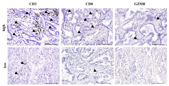 High-tumor-infiltrating lymphocyte (TIL) and low-TIL infiltrate. Representative photos with high and low CD3, CD8 and granzyme B (GZMB) infiltrate in two non-small cell lung cancer (NSCLC) patients. Arrowheads depict positive immunostaining. Scale bar: 100 μm.
