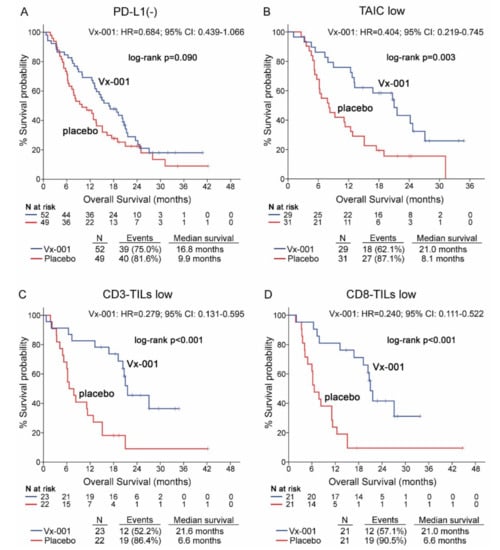 The effect of the Vx-001 vaccine on OS was evaluated according to the expression of PD-L1 on tumor cells. The survival analysis showed that PD-L1 is not a discriminatory factor since Vx-001 could not significantly improve OS in patients with either PD-L1(-) (9.9 vs. 16.8 months, p = 0.09; (Figure 2A)) or PD-L1 (+) tumors (Table S4) compared to placebo. Conversely, OS was significantly prolonged in Vx-001-treated compared to placebo-treated patients within TAIC low (8.1 vs. 21 months, p = 0.003; HR = 0.404, 95% CI 0.219–0.745; (Figure 2B)), CD3-TIL low (6.6 vs. 21.6 months, p < 0.001; HR = 0.279 95% CI 0.131–0.595; (Figure 2C)) and CD8-TIL low (6.6 vs. 21 months, p < 0.001; HR = 0.240, 95% CI 0.111–0.522; (Figure 2D)) sub-cohorts.
