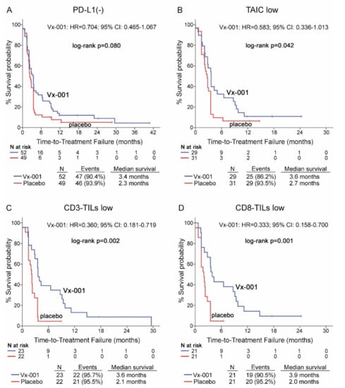 Vx-001 did not demonstrate any effect on TTF in PD-L1(-) patients (2.3 vs. 3.4 months, p = 0.08) (Figure 3A). Further analysis of Vx-001’s effect on TTF demonstrated that Vx-001 significantly prolonged TTF compared to placebo in patients with a TAIC low (2.7 vs. 3.6 months, p = 0.042; HR = 0.583, 95% CI 0.336–1.013; (Figure 3B)), CD3-TIL low (2.1 vs. 3.6 months, p = 0.002; HR = 0.360, 95% CI 0.181–0.719; (Figure 3C)) or CD8-TIL low (2 vs. 3.9 months, p = 0.001; HR = 0.333, 95% CI 0.158–0.700; (Figure 2D)) phenotype.