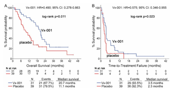 Seventy patients with GZMB-TIL low and 15 patients with GZMB-TIL high tumors were further analyzed in order to investigate any relation between the functionality of TILs and activity of Vx-001. Thirty nine out of 68 (57.4%) patients with GZMB-TIL low tumors were classified as CD8-TIL high. Vx-001 significantly improved OS (11.1 vs. 20.7 months, p = 0.011; HR = 0.490, 95% CI 0.278–0.863; (Figure 4A)) and TTF (2.3 vs. 3.5 months, p = 0.023, HR = 0.575, 95% CI 0.346–0.955; (Figure 4B)) in patients with GZMB-TIL low but not in patients with GZMB-TIL high tumors, although the number of GZMB-TIL high patients was small (n = 15) (Tables S4 and S5).