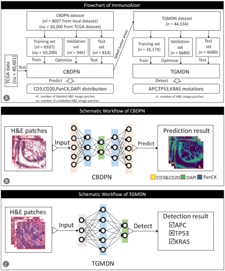 A computational framework may provide a more comprehensive, accurate, and objective method to assist in therapeutic optimization [17]. The application of deep learning (DL) in medical image processing, especially histological image analysis, has been shown to extract valuable information that is imperceptible to humans [18,19,20]. Recent advances in DL and digital pathology have made it possible to derive fluorescence images from transmitted light images of unlabeled fixed or live biological samples [21], thus demonstrating the capability and reliability of DL methodology as a tool to facilitate biomarker prediction tasks. Burlingame et al. introduced an adversarial deep learning method that they used to infer fluorescence images based on the H&E-stained tissue from a patient with pancreatic ductal adenocarcinoma [22], further verifying the practicability of DL-based methods as a type of prediction tool for complex human tissues. Moreover, previous research has also suggested that a DL neural network can detect gene mutations based on H&E images [23], demonstrating the potential application of DL-based methods in the field of pathological image analysis. Hence, we hypothesized that DL may facilitate the evaluation of immune cell and cancer cell distribution in TMEs by predicting the cellular biomarker distribution, meanwhile offer guidance for tumor gene mutation analysis.
