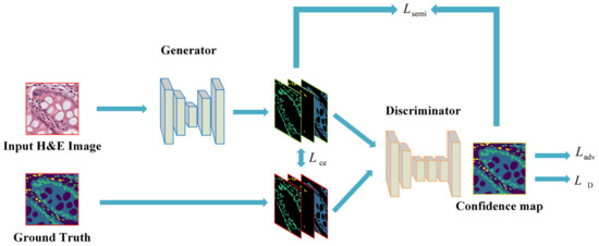 In order to tackle the problem of insufficient labeled data and the heavy burden of annotation work, our semi-supervised biomarker distribution prediction network utilizes an adversarial learning paradigm [29], the structure of which consists of a generator and a discriminator. In order to better extract useful features from pathological images and optimize performance, the generator was structured to have an encoder–decoder form. The generator can be any form of segmentation network which takes in the original H&E image and outputs the class probability maps and the discriminator is organized the same as [29]. Note that the generator can also be used as an independent, fully supervised biomarker distribution prediction network. The semi-supervised network structure is illustrated in Figure 2.