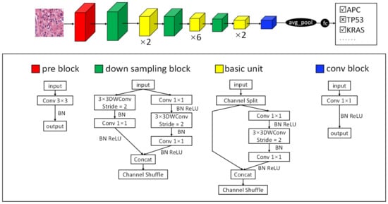 For the TGMDN, we used the ShuffleNet V2 [40] network to conduct the multilabel training process to detect APC, TP53, and KRAS mutations in colon cancer patients. ShuffleNet V2 was selected because it has demonstrated good performance on gene mutation detection tasks [41]. The network learned the features of each of the three mutations, with each mutation classification corresponding to an independent binary classification. We implemented a binary cross-entropy loss function and sigmoid layer to replace the softmax layer; this allowed each H&E patch to be associated with several binary labels. The entire network structure is illustrated in Figure 4.