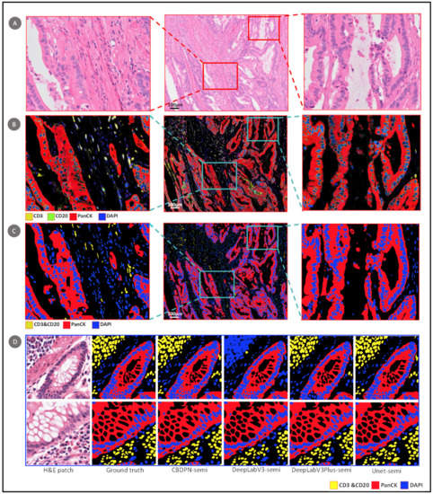 For the CBDPN, the dataset included two types of data: (1) pixel-level labeled H&E image data of 8697 H&E image patches and their corresponding label masks of 8 colon cancer patients from Peking University Cancer Hospital and Institute, and (2) unlabeled image data of 50,801 H&E image patches of 60 colon cancer patients acquired from the TCGA dataset, Colon Adenocarcinoma (COAD) project. For the tissue samples acquired from Peking University Cancer Hospital and Institute, the H&E and mIHC stains were conducted. PanCK was used to characterize tumor cells, and CD3 and CD20 were used to characterize TILs [26], and DAPI for nuclei. The staining and scanning protocols are described in Appendix A. First, in order to facilitate annotation, a registration procedure was performed after acquisition of the H&E and mIHC images to ensure that the H&E and mIHC images were spatially registered. Second, the registered H&E and mIHC whole slide images (WSI) were tiled into 512 × 512-pixel patches, and were pixel-level annotated by 3 board certified pathologists. Third, a color normalization [27,28] procedure was conducted to improve the image quality. Finally, we conducted a data augmentation procedure to obtain 8697 H&E image patches of which the training, validation, and testing image data ratio was set to be approximately 8:1:1, yielding 6937 image patches in the training set, 946 image patches in the validation set, and 814 images in the test set. The whole data processing pipeline is illustrated in Figure S1. The registration procedure and other post-processing details are described in Appendix B. Additionally, for the unlabeled image data from the TCGA dataset, the WSIs of 60 patients were tiled into 512 × 512-pixel patches, yielding 50,801 image patches in total, among which 10,200 image patches of 35 patients with background proportion below 50% were utilized for semi-supervised training, and 40,601 image patches of the other 25 patients were utilized for performance validation.