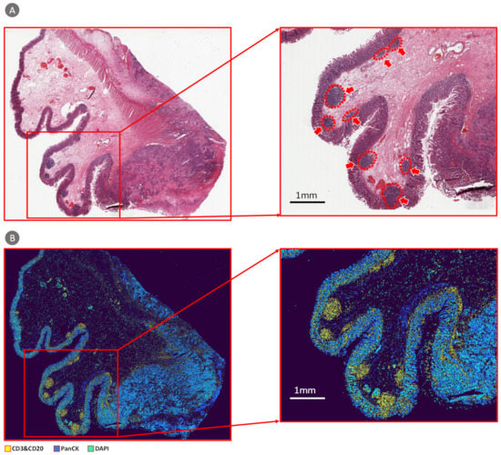 In order to acquire a clear view of the structural details of the pathological tissue, the H&E- and mIHC-stained slides were scanned at 40× magnification using a high-resolution Mantra system scanner (PerkinElmer, Waltham, MA, USA).