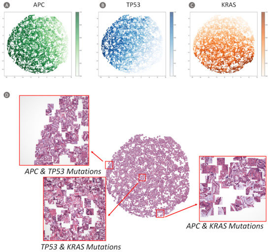 Two-dimensional visualization of TGMDN output obtained by implementing the t-SNE Algorithm. (A) Cluster result of APC mutation probability generated by the TGMDN. (B) Cluster result of TP53 mutation probability generated by the TGMDN. (C) Cluster result of KRAS mutation probability generated by the TGMDN. (D) Patch-embedded t-SNE representation with magnifications showing specific mutations that were detected based on the H&E image data from test set that were obtained from the TCGA Colon adenocarcinoma (COAD) project.