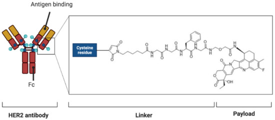 Schematic figure representing trastuzumab deruxtecan (T-Dxd). T-Dxd is composed of an anti-HER2 antibody, a cleavable tetrapeptide-based linker, and deruxtecan—a topoisomerase I inhibitor. The maleimide group in deruxtecan is delivered by the antibody.