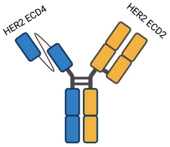 Schematic structure of ZW25, presenting a unique binding geometry and mechanism of action. ZW25 is a bispecific HER2-directed antibody able to bind two HER2 epitopes: the pertuzumab binding domain ECD2 and the trastuzumab binding domain ECD4.