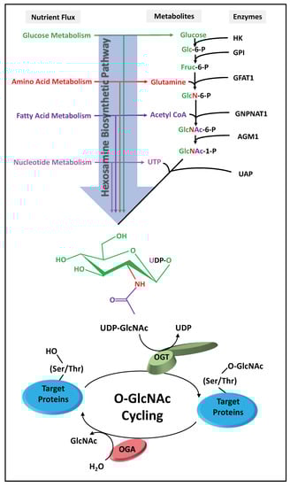 - Hanover, J.A.; Krause, M.W.; Love, D.C. The Hexosamine Signaling Pathway: O-GlcNAc Cycling in Feast or Famine. Biochim. Biophys. Acta 2010, 1800. [Google Scholar] [CrossRef] [PubMed]