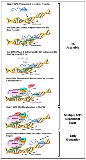 Of all the RNAPs and their associated synthesis machinery, eukaryotic RNAP II is the most versatile, as it recognizes and catalyzes transcription from the most diverse set of gene promoters [31]. It also transcribes the widest dynamic range of mRNA expression levels, ranging from just a few mRNA copies for some genes to millions of copies for others [32]. Control of RNAP II activity occurs at many different levels, including recruitment to promoters, PIC formation, transcription initiation, elongation, splicing, and termination. The way in which RNAP II progressively movies through these events is referred to as the transcription cycle. PTMs on the carboxyl-terminal domain (CTD) of RNAP II play a major role in the orchestration of these events. In humans, the CTD of RNAP II consists of 52 imperfect heptad amino acid repeats of predominantly YSPTSPS [33,34,35]. The phosphorylation status of the CTD defines different forms of RNAP II. RNAP IIA is the unphosphorylated form, and RNAP IIO is the phosphorylated form. Early RNAP II transcriptional cycling models established in the late 1980s and early 1990s suggested that RNAP IIA was the RNAP II spices recruited to gene promoters and required for PIC formation, whereas RNAP IIO was generated later in the transcription cycle during transcriptional initiation [36]. In addition to RNAP IIA and RNAP IIO, a third O-GlcNAcylated species of RNAP II (RNAP IIγ) was identified by Kelly et al. [37]. However, the role of this RNAP species has remained unknown until recently.