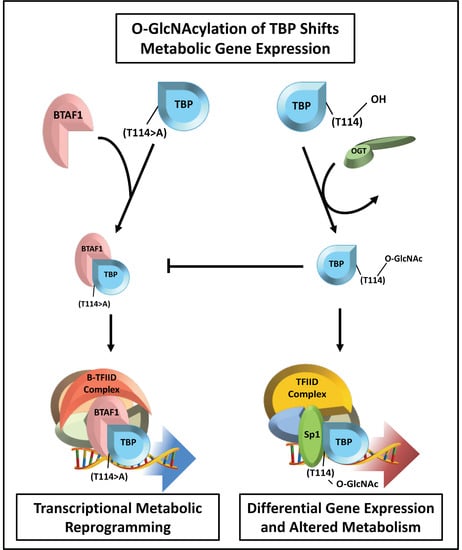 - Hardiville, S.; Banerjee, P.S.; Selen Alpergin, E.S.; Smith, D.M.; Han, G.; Ma, J.; Talbot, C.C., Jr.; Hu, P.; Wolfgang, M.J.; Hart, G.W. TATA-Box Binding Protein O-GlcNAcylation at T114 Regulates Formation of the B-TFIID Complex and Is Critical for Metabolic Gene Regulation. Mol. Cell 2020, 77, 1143–1152.e1147. [Google Scholar] [CrossRef]