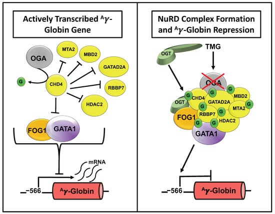 O-GlcNAcylation regulates the formation and function of the NuRD complex. Aγ-globin expression is silenced by the recruitment of NuRD complex to the –566 GATA binding site. OGA removes O-GlcNAc (green circle “G”) from CHD4 (a subunit of the NuRD complex), thereby preventing the assembly of the NuRD complex at the –566 site (left panel). When OGA is inhibited by TMG, OGT associates and O-GlcNAcylates CHD4, stimulating the formation of the NuRD complex at the –566 site, which represses Aγ-globin gene transcription (right panel). Additional O-GlcNAc sites have been found on every subunit of the NuRD complex, however, their function remains unknown.