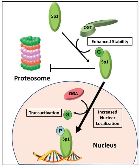 Specificity protein 1 (Sp1) is a transcription factor that is frequently overexpressed in a wide variety of human cancers and contributes to malignant transformation [90]. Sp1 is a ubiquitous and multifunctional transcription factor that targets promoters that lack a TATA box and are GC rich [91]. Sp1 activates the expression of genes that play a role in tumorigenesis via alterations in angiogenesis, cell growth, differentiation, apoptosis, cellular reprogramming, and heat shock protein gene expression following stress [92,93]. Sp1 is a transcription factor that illustrates the role of O-GlcNAc and O-GlcNAc cycling in transcription [94]. For example, O-GlcNAcylation of Sp1 protects the protein from proteasomal degradation and promotes nuclear localization [91]. Once in the nucleus, O-GlcNAc is removed by OGA so that Sp1 can be phosphorylated, which promotes DNA binding [95]. Thus, O-GlcNAcylation of Sp1 appears to play a central role in its nuclear localization, transactivation, and stability (Figure 5).