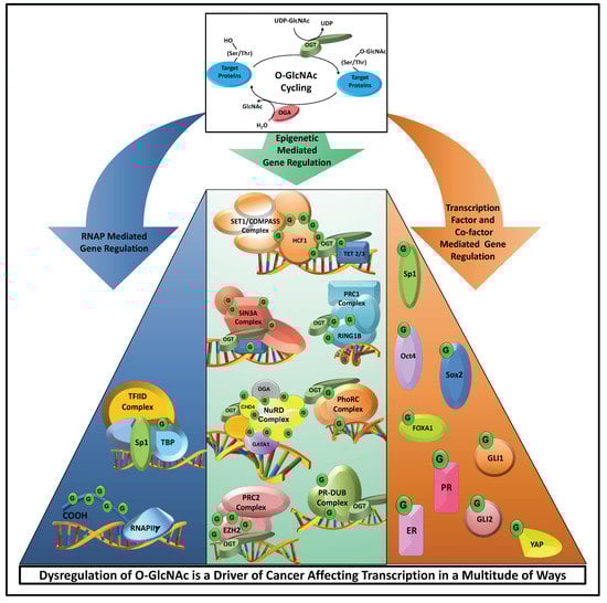 Almost all RNAP II-associated transcription factors are O-GlcNAcylated, often at multiple sites [53]. O-GlcNAc has been found on RNAP II, RNAP accessory transcription factors, co-activators, co-repressors, and lineage-specific transcription factors. O-GlcNAcylation of these transcriptional proteins affects function in various ways, but overall, the major effects are on their activity, localization, and/or stability. Some transcriptional proteins rely solely on one of these properties, for example, activity. Others use all three mechanisms to regulate their function and influence gene transcription. A growing number of studies highlight the importance of O-GlcNAc in transcription factor function and demonstrate how abnormal O-GlcNAcylation, a common phenotype found in all cancers, leads to abnormal gene expression that favors cancer occurrence, progression, and metastasis. In a non-exhaustive manner, examples of recent studies highlighting the role of O-GlcNAcylation of transcription factors and the co-activator yes-associated protein 1 (YAP) in promoting cancer are discussed below.