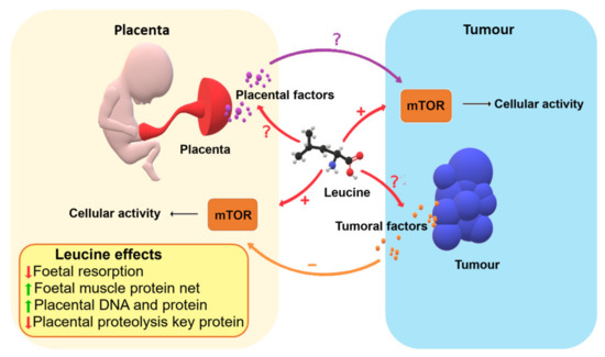 Cancer during pregnancy could lead to a nutritional competition between the foetus and tumour cells, and the damage of the tumoural factors can compromise the placenta, contributing to the impairment of the foetal development [24]. Foetal growth and maternal physiological adaptations during pregnancy require an acceptable amount of nutrients to ensure a healthy pregnancy. In pregnant rats, tumoural factors such as PIF, IL-6, and TNF-α could promote a reduction of amino acid uptake by the placenta, which has been evidenced by low activation of mTOR pathway in this tissue [16,24,32]. As mentioned above, a leucine-rich diet is beneficial to minimise the deleterious effects of lean mass loss induced by the evolution of tumour growth [115]. In addition, in an experimental mouse model of cancer-induced cachexia (murine colon adenocarcinoma (MAC16)) during pregnancy, we also demonstrated that a leucine-rich diet decreased foetal resorption, recovered foetal weight, and modulated mTOR expression in placental cells [24,124]. Our study observed that in pregnant mice treated with PIF obtained from MAC16 tumour, skeletal muscle spoliation occurred, which indicates that tumour factors promote deleterious effects to healthy tissues and foetal tissues [23,24]. Additionally, the leucine-rich diet minimised some deleterious parameters found in tumour-bearing mice injected with tumour factor PIF. This reinforces that this amino acid has a protective effect in the case of unhealthy conditions promoted by tumour development [24].
