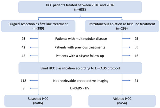 Our starting population was composed of 688 cirrhotic patients: of these, 389 underwent SR and 299 received PA as first-line treatment between 2010 and 2016. One-hundred-eighty-eight patients (93 resections and 95 ablations) were excluded as they presented multinodular disease. Other 125 patients (42 resections and 83 ablations) were excluded because of previous HCC diagnosis and/or treatment on past medical history. Eighty-eight patients (42 resections and 46 ablations) were excluded for a <1-year follow-up, so our population of 287 patients was composed of 75 ablated and 212 resected HCC. Preoperative imaging was not available for 118 resected and 21 ablated patients; 8 resected patients who presented macrovascular infiltration (Li-RADS-TIV) were furtherly excluded after imaging review. Our final population was composed of 140 patients: 86 resected and 54 ablated HCC. The workflow of patient selection is depicted in Figure 1.