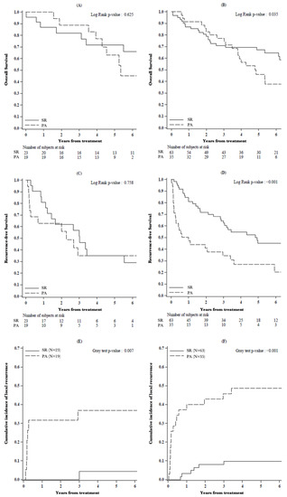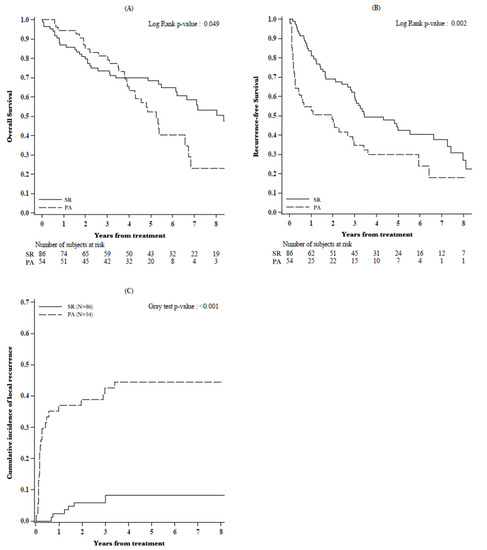 Considering the general population, SR offered significantly better OS (87.1%, 73.6% and 68.3% vs. 94.4%, 81.2% and 52.2% 1-, 3- and 5-year OS; p = 0.049), RFS (82.2%, 60.7% and 42.5% vs. 52.5%, 34.6% and 29.8% 1-, 3- and 5-year RFS; p = 0.002) and lower incidence of local recurrence (2.4%, 7.1% and 8.2% vs. 37.0%, 42.6% and 44.4% 1-, 3- and 5-year CIF of local recurrence; p < 0.001) compared to PA (Figure 2).