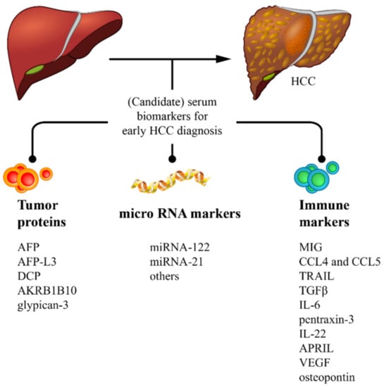 HCC-related mortality has steadily increased and almost tripled in the United States since the 1980s, where it is the fastest rising cause of cancer-related deaths with more than 39,000 cases and 29,000 deaths in 2018 [5]. Importantly, according to World Health Organization estimates, globally, more than one million patients will die from liver cancer in 2030 [6]. These data underscore the magnitude of the HCC-associated disease burden, which, despite the advances made in its surveillance and diagnosis, is still often diagnosed at advanced stages, precluding timely and eventually curative therapeutic intervention resulting in poor prognosis. Thus, early HCC diagnosis is critical in order to improve patient outcomes. Proposed strategies for early detection of HCC include adherence to surveillance programs in populations at risk and the development of sensitive and specific diagnostic biomarkers [7,8]. HCC surveillance comprising of ultrasound screening every six months is recommended for all patients with cirrhosis, but, as mentioned above, tailoring HCC surveillance programs may be necessary for certain diseases (i.e., HBV and NAFLD) so to include at-risk non-cirrhotic patients [9]. In this regard, non-cirrhotic HBV-infected individuals are advised to undergo surveillance in a range of ages based on geographic location across the globe. Participation in surveillance for HCC in cirrhotic individuals has been regarded as suboptimal, with some studies in the United States and Europe showing that less than 40% of patients with cirrhosis undergo proper HCC surveillance [10,11]. A large study from our group involving over 1300 HCC cases in South America found that less than 50% of HCCs were diagnosed via surveillance [12]. Although several issues contribute to such low participation in surveillance, the lack of a reliable blood biomarker that is easy to detect and that provides a high degree of sensitivity and specificity is certainly among the most important contributing factors. Due to the diverse genetic nature of HCC and the existence of different underlying liver diseases, no biomarker has progressed to the point of implementation. Underlying liver disease is indeed a point of contention as in processes like viral hepatitis; there is an ongoing inflammatory cascade that obscures the approach to identifying immune or inflammatory markers that could be related to the tumor. With new advancing technologies, which allow us to detect low expressing proteins, RNAs and genetic material in endovesicles, a number of new circulating biomarkers are currently under study [8,13]. In this review, we aim to summarize the available information and recent developments on HCC biomarkers detected in serum, classified as protein, miRNA and immune biomarkers (Figure 1), which may impact early HCC diagnosis and, therefore, implementation of appropriate management that can optimize prognosis in HCC. We aim to present what are considered to be the most advanced, important or novel biomarkers and not to present an exhaustive review.