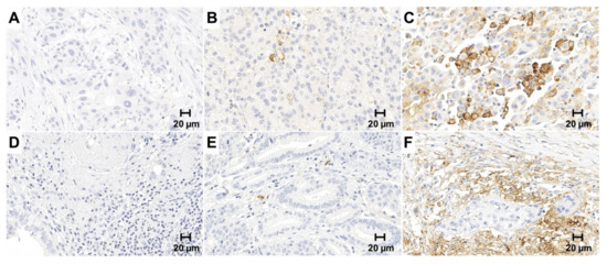 PD-L1 immunohistochemistry in gallbladder cancer and infiltrating immune cells. PD-L1 expression was evaluated on both the tumor and immune cells and expressed as Tumor Proportion Score (TPS), Immune Cell Score (IC) and Combined Positivity Score (CPS), respectively. Only membranous staining was counted. Upper panel: Representative microphotographs of negative (A) low (<10%); (B) high (>10%); (C) PD-L1 expression in the tumor cells. Lower Panel: Representative microphotographs of negative (D) low (<10%); (E) high (>10%); (F) PD-L1 expression in tumor infiltrating immune cells. Original magnification 400×.