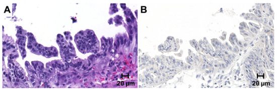 PD-L1 immunohistochemistry in high-grade biliary intraepithelial neoplasia. PD-L1 expression was also assessed in a number of 74 concomitant high-grade biliary intraepithelial neoplasia (BilIN) precursor lesions. (A) (HE). All BilIN lesions showed complete negativity for PD-L1 (B). Original magnification 400×.
