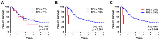 Kaplan-Meier survival analysis, stratified for Tumor Proportion Score. Survival data of a subset of 104 patients with available follow-up information were compared using Kaplan-Meier curves and log-rank testing. While at a Tumor Proportion Score (TPS) cut-off value at 1% no significant differences were observed (A), at a 10% (B) and 25% (C) cut-off, median survival was significantly worse in patients with high PD-L1 expression and six times lower than of those with lower expression (p < 0.001, 0.4 years vs. 2.2 years for both analyses).