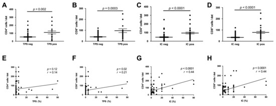 To study the relationship between PD-L1 expression and host antitumor immunity in the microenvironment, we next characterized the tumor immune cell infiltrate by immunohistochemical quantification of CD4+- and CD8+ T-cells. Stratification for PD-L1 expression revealed that tumors with positive PD-L1 expression either on tumor or immune cells (TPS/IC ≥ 1%) showed significantly increased infiltration of CD4+- and CD8+ T-cells (p = 0.002/p = 0.0003 for TPS; p < 0.0001/p < 0.0001 for IC) (Figure 4A–D). The median number of CD8+ T-cells was nearly three times higher in tumors with positive tumoral PD-L1 expression as compared to tumors lacking PD-L1 expression (30 vs. 80 cells/dot). While the densities of both CD4+- and CD8+ T-cells positively correlated with the IC (each p < 0.0001), considering the TPS this correlation was only significant for CD8+ T-cells (p = 0.02) (Figure 4E–H).