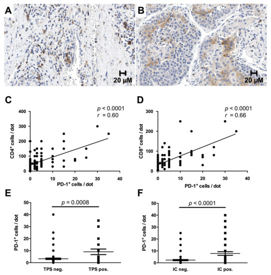 PD-1+ immune cells are increased in tumors with PD-L1 expression. More than half of the cases demonstrated strong membranous and cytoplasmic staining for PD-1 in a fraction of intra- and peritumoral immune cells (A), while positivity in the tumor epithelium was only detected in a single case with adenosquamous morphology (B). Co-expression of PD-1 and CD4 or CD8 was confirmed by correlation analysis (C,D). Furthermore, enhanced PD-1 expression was observed in cases with a Tumor Proportion Score (TPS) or Immune Cell score (IC) ≥ 1% (E,F). Original magnification in (A,B): 400×.