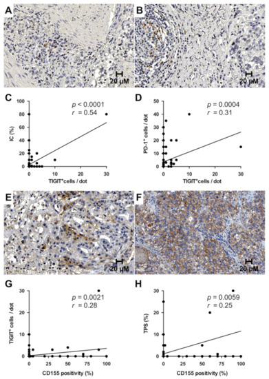 In contrast to TIGIT, CD155 was exclusively expressed by the tumor epithelium with a foremost moderate to strong membranous immunoreactivity. Positivity for CD155 was identified in 25.2% (30/119) of all evaluable cases, ranging from focal staining (Figure 6E) to ubiquitous immunoreactivity in all tumor cells (Figure 6F). Among the CD155-positive cases, median CD155 expression was 50%. Interestingly, tumoral CD155 positivity significantly correlated with the number of TIGIT-positive TILs (p = 0.002) and PD-L1 expression in tumor cells (p = 0.006 for TPS) (Figure 6G,H).