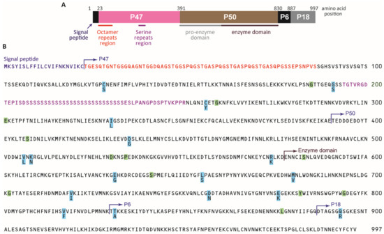 In the present study, we investigated whether the presence of mixed infection at the Pf serine repeat antigen-5 (Pfsera5) locus (on chromosome 2) [17] is associated with eBL in Malawi. Pfsera5 has been identified as a blood-stage vaccine candidate [18,19], in part because antibodies targeting Pfsera5, measured using SE36—a recombinant molecule of PfSERA5 [20]—were protective against malaria and eBL [7]. The potential as a vaccine target also prompted interest in the genetic diversity at this locus. Pfsera5 codes for a 120-kDa precursor (Figure 1A), which is critical to Pf blood-stage infection (and egress from the parasitophorous vacuole) and is an antigenic target of blood-stage immunity to malaria [21]. The PfSERA5 precursor is processed by removing the signal peptide and the protein trimmed into three fragments: the P47, P56, and P18 kDa domains; P56 is further processed to P50 and P6 fragments [22,23,24,25]. Pfsera5 sequence diversity is introduced by insertions and deletions in the P47 fragment in the protein domain containing the octamer and serine repeats (where protective epitopes are located) [26], and by point mutations in a stretch without repeats [27], but the association of Pfsera5 diversity with eBL is unknown.