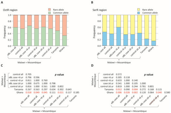 Comparison of the proportion of rare and common alleles among endemic Burkitt lymphoma (eBL) cases and controls. (A) Comparison of the proportion of the rare and common alleles in the octamer repeat (OctR) region. Alleles with a frequency >0.2 are defined as common alleles, while the rest are defined as rare alleles. (B) Comparison of the proportion of the rare and common alleles in the serine repeat (SerR) region. Alleles with a frequency >0.1 are defined as common alleles, while the rest are defined as rare alleles. (C,D) p-values of the Fisher’s exact test (C: OctR region; D: SerR region). p < 0.05 are shown in red.