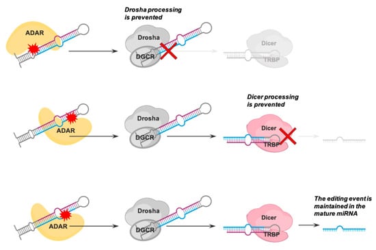 Steps of miRNA biogenesis at which adenosine to inosine (A-to-I) RNA editing can prevent the processing of pri- or pre-miRNA. In certain cases, however, the A-to-I editing event does not impair miRNA biogenesis and is maintained in the mature miRNA.