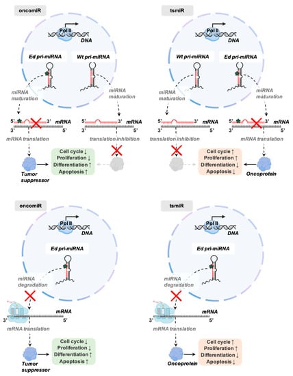 Possible effects of miRNA editing in the context of cancer. Editing of mature miRNAs can prevent the targeting of complementary regions in the 3′UTRs of original mRNAs. In case an editing event disrupts the base pairing of an oncomiR with its target mRNA (transcribed from a tumor suppressor gene), the translational process will lead to the expression of the tumor suppressor protein, increasing processes related to cell cycle arrest, differentiation, and/or apoptosis (top, left). In case an editing event disrupts the base pairing of a tsmiR with its target mRNA (transcribed from a proto-oncogene), the translational process will lead to the expression of the oncoprotein, increasing processes related to cell cycle progression, proliferation, and migration (top, right). However, editing of pri- or pre-miRNAs can cause the blockage of their biogenesis, significantly decreasing the expression of their related mature miRNAs. Thus, similar considerations can be done in the case of the underexpressed miRNA functions as an oncomiR (bottom, left) or a tsmiR (bottom, right).