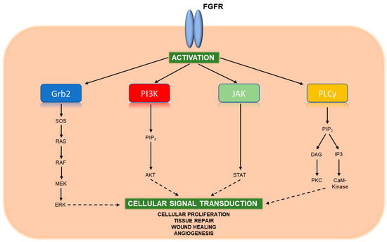 Key signaling pathways of activated FGFR. Upon binding FGF ligands, FGFR molecules dimerize and undergo cross-phosphorylation of tyrosine residues within their activation loops located near the cytoplasmic tail. This phosphorylation activates the kinase domain, which in turn binds and phosphorylates adaptor proteins of downstream signaling pathways. Four particularly important pathways include RAS-MAPK, PI3K-AKT, JAK-STAT, and PLC, which contribute to cellular proliferation, tissue repair, wound healing, and angiogenesis.