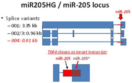 Illustration of miR205HG gene locus with three transcript variants and their corresponding sizes (kb).