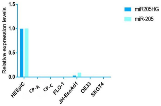 Expression levels of miR205HG and miR-205 in BE and EAC cell lines relative to NE (normal esophagus) cells. Expression levels of miR205HG and miR-205 are shown in BE (CP-C and CP-A) and EAC (OE33, Flo-1, SKGT4, and JH-ea1) cell lines relative to NE (HEEPiC-Human Esophageal Epithelial Cells) cells. Both miR205HG and miR-205 were neither not detectable or downregulated tenfold or greater in BE and EAC cells.