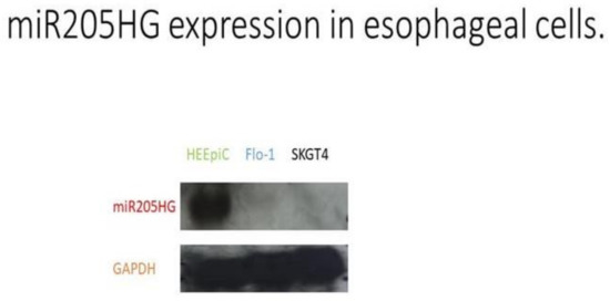 miR205HG expression assessed via Northern blotting. glyceraldehyde 3-phosphate dehydrogenase (GAPDH) serves as an internal control. HEEPiC: normal primary esophageal epithelial cells; SKGT4: EAC-derived cell line; Flo-1: EAC-derived cell line (full blots can be found in Supplementary Materials).