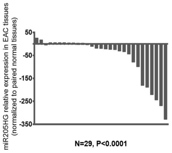 miR205HG expression in NE-EAC tissue pairs. Twenty-nine matched NE-EAC tissue pairs were assessed for miR205HG expression by qRT-PCR. miR205HG expression was downregulated relative to NE in the majority of EACs studied (26/29, average fold-change 68.6, paired t-test p-value < 0.0001).