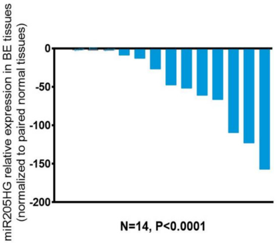 miR205HG expression in NE-BE tissue pairs. Fourteen matched NE-BE tissue pairs were assessed for miR205HG expression by qRT-PCR. miR205HG was downregulated relative to NE in all BE tissues studied (14/14, average fold-change 48.3, paired t-test p-value < 0.0001).