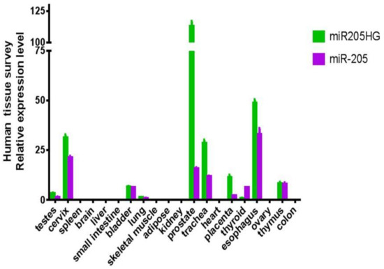 miR205HG expression in various normal human tissues. Twenty different normal human tissues were assessed for miR205HG expression by qRT-PCR. miR205HG was expressed in normal esophagus, cervix, prostate, trachea, and thymus.