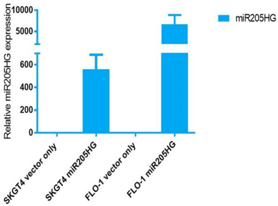 miR205HG expression in miR205HG-stably transfected clones. SKGT4 and FLO-1 EAC cell lines were miR205HG-stably transfected; qRT-PCR confirmed miR205HG overexpression in both of these cell lines relative to vector-only transfected cells.